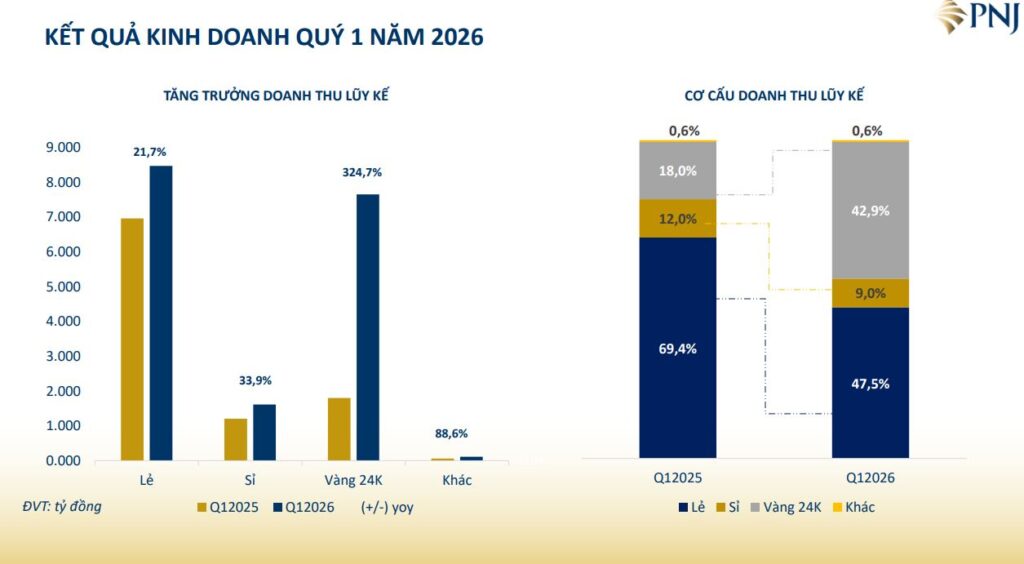 Mặc dù biên lợi nhuận gộp trung bình giảm nhẹ từ 21,3% xuống còn 20%, nhưng đây là kết quả của sự thay đổi trong cơ cấu doanh thu khi tỷ trọng vàng 24K (vốn có biên lợi nhuận thấp hơn trang sức) tăng vọt.