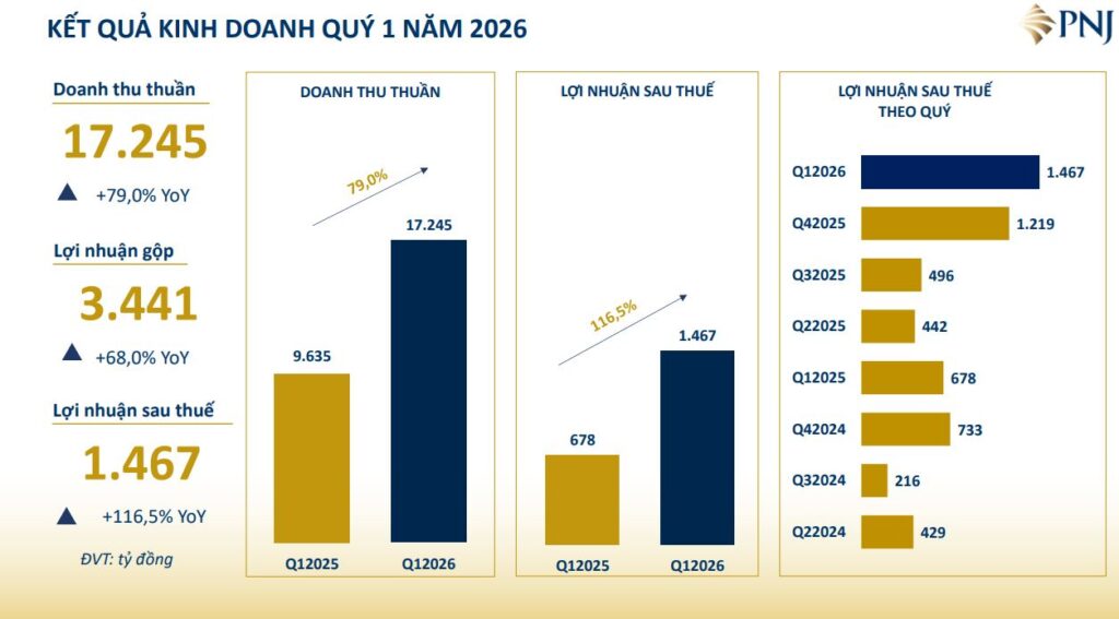 Trong ba tháng đầu năm 2026, PNJ ghi nhận doanh thu thuần đạt 17.245 tỷ đồng, tăng trưởng mạnh mẽ 79% so với cùng kỳ năm trước. Lợi nhuận sau thuế của doanh nghiệp cũng đạt mức ấn tượng 1.467 tỷ đồng, tăng tới 116,5%. Tính trung bình, mỗi ngày trong quý I, PNJ thu về khoảng 16,3 tỷ đồng lợi nhuận.
